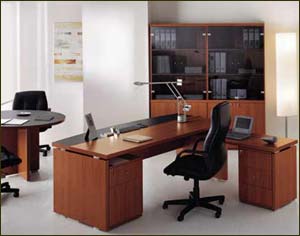 При длине 180/160/120 см столешница имеет прямоугольную форму. Между столешницей и боковинами - декоративные металические вставки. Разнообразные варианты шкафов и угловых соединений позволяют осуществить комплексное решение обстановки для больших офисов.